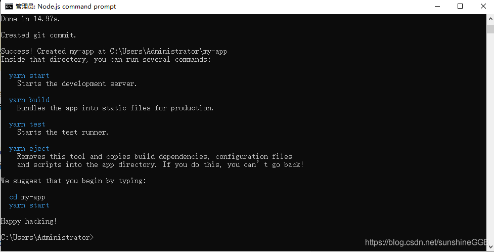 运行Node.js command prompt,输入命令: npx create-react-app my-app (如下图)