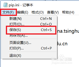 8.配置文件配置好以后,点击文件,再点击保存。然后就可以关闭文件编辑框了。然后重新打开一个cmd命令行窗口,使用pip安装任意一个模块,这个时候就能看到,使用的是清华大学的下载地址了,下载速度也快很多。