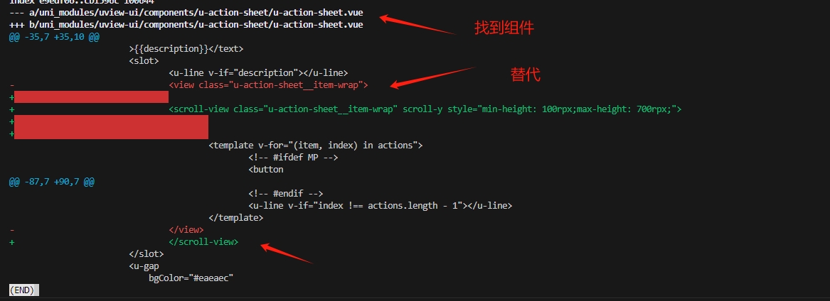 找到文件 /uni_modules/uview-ui/components/u-action-sheet/u-action-sheet.vue 找到 u-action-sheet__item-wrap 的类名 <view class="u-action-sheet__item-wrap"> 修改成 <scroll-view class="u-action-sheet__item-wrap" scroll-y style="min-height: 100rpx;max-height: 700rpx;"> 标签结尾的 </view> 也要替换成 </scroll-view> done!
