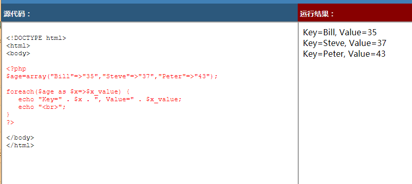 <?php $age=array("Bill"=>"35","Steve"=>"37","Peter"=>"43"); foreach($age as $x=>$x_value) { echo "Key=" . $x . ", Value=" . $x_value; echo "<br>"; } ?>
