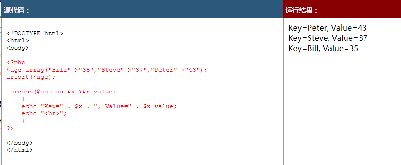 <?php $age=array("Bill"=>"35","Steve"=>"37","Peter"=>"43"); arsort($age); ?>