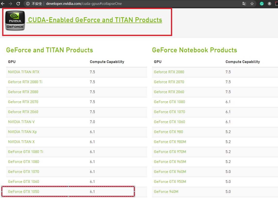 可以去英伟达显卡官网查询计算能力:https://developer.nvidia.com/cuda-gpus#collapseOne