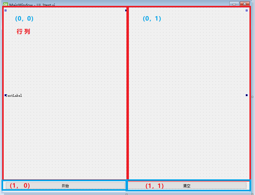 # -*- coding: utf-8 -*- # Form implementation generated from reading ui file '.\UI_1test.ui' # # Created by: PyQt5 UI code generator 5.15.1 # # WARNING: Any manual changes made to this file will be lost when pyuic5 is # run again. Do not edit this file unless you know what you are doing. from PyQt5 import QtCore, QtGui, QtWidgets class Ui_MainWindow(object): def setupUi(self, MainWindow): #主窗体初始化设置 MainWindow.setObjectName("MainWindow") MainWindow.resize(800, 600) #获取主窗体引用 self.centralwidget = QtWidgets.QWidget(MainWindow) self.centralwidget.setObjectName("centralwidget") #添加布局 self.gridLayout = QtWidgets.QGridLayout(self.centralwidget) self.gridLayout.setObjectName("gridLayout") #添加label self.label = QtWidgets.QLabel(self.centralwidget) self.label.setObjectName("label") self.gridLayout.addWidget(self.label, 0, 0, 1, 2) # 第0行第0列 占用一行 2列 #添加按钮1 self.pushButton = QtWidgets.QPushButton(self.centralwidget) self.pushButton.setObjectName("pushButton") self.gridLayout.addWidget(self.pushButton, 1, 0, 1, 1)# 第1行第0列 占用一行 1列 self.pushButton_2 = QtWidgets.QPushButton(self.centralwidget) #添加按钮2 self.pushButton_2.setObjectName("pushButton_2") self.gridLayout.addWidget(self.pushButton_2, 1, 1, 1, 1)# 第1行第1列 占用一行 1列 MainWindow.setCentralWidget(self.centralwidget) self.retranslateUi(MainWindow) QtCore.QMetaObject.connectSlotsByName(MainWindow) def retranslateUi(self, MainWindow): _translate = QtCore.QCoreApplication.translate MainWindow.setWindowTitle(_translate("MainWindow", "MainWindow")) self.label.setText(_translate("MainWindow", "TextLabel")) self.pushButton.setText(_translate("MainWindow", "开始")) self.pushButton_2.setText(_translate("MainWindow", "清空"))