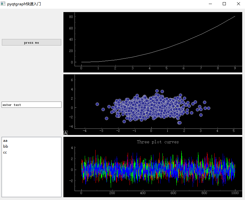 from PyQt5.QtWidgets import QPushButton,QWidget,QApplication,QGridLayout,QListWidget,QLineEdit import pyqtgraph as pg import sys import numpy as np class Example(QWidget): def __init__(self): super(Example, self).__init__() self.initUI() self.linePlot() self.scatterPlot() self.three_curves() def initUI(self): self.setGeometry(400,400,800,620) self.setWindowTitle("pyqtgraph快速入门") ## 创建一些小部件放在顶级窗口中 btn = QPushButton('press me') text = QLineEdit('enter text') listw = QListWidget() listw.addItems(["aa", "bb", "cc"]) self.gridLayout = QGridLayout(self) ## 将部件添加到布局中的适当位置 self.gridLayout.addWidget(btn, 0, 0) self.gridLayout.addWidget(text, 1, 0) self.gridLayout.addWidget(listw, 2, 0) self.setLayout(self.gridLayout) def linePlot(self): plt1 = pg.PlotWidget() plt1.plot([i for i in range(10)], [i * i for i in range(10)]) self.gridLayout.addWidget(plt1, 0, 1, 1, 1) def scatterPlot(self): plt2 = pg.PlotWidget() x = np.random.normal(size=1000) y = np.random.normal(size=1000) plt2.plot(x, y, pen=None, symbol="o") self.gridLayout.addWidget(plt2, 1, 1, 1, 1) def three_curves(self): plt3 = pg.PlotWidget(title="Three plot curves") x = np.arange(1000) y = np.random.normal(size=(3, 1000)) for i in range(3): plt3.plot(x, y[i], pen=(i, 3)) ## setting pen=(i,3) 自动创建3个不同颜色的笔 self.gridLayout.addWidget(plt3, 2, 1, 1, 1) if __name__ == '__main__': app = QApplication(sys.argv) ex = Example() ex.show() sys.exit(app.exec_())