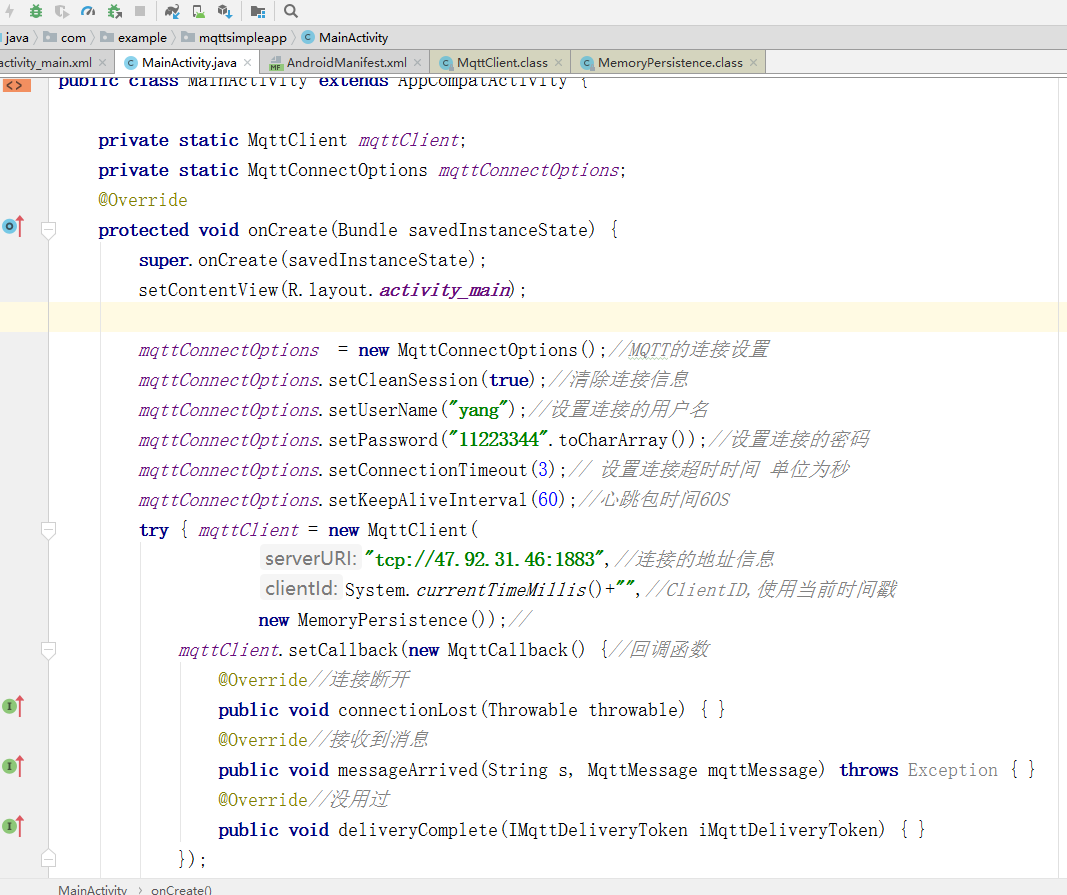 public class MainActivity extends AppCompatActivity { private static MqttClient mqttClient; private static MqttConnectOptions mqttConnectOptions; @Override protected void onCreate(Bundle savedInstanceState) { super.onCreate(savedInstanceState); setContentView(R.layout.activity_main); mqttConnectOptions = new MqttConnectOptions();//MQTT的连接设置 mqttConnectOptions.setCleanSession(true);//清除连接信息 mqttConnectOptions.setUserName("yang");//设置连接的用户名 mqttConnectOptions.setPassword("11223344".toCharArray());//设置连接的密码 mqttConnectOptions.setConnectionTimeout(3);// 设置连接超时时间 单位为秒 mqttConnectOptions.setKeepAliveInterval(60);//心跳包时间60S try { mqttClient = new MqttClient( "tcp://47.92.31.46:1883",//连接的地址信息 System.currentTimeMillis()+"",//ClientID,使用当前时间戳 new MemoryPersistence());// mqttClient.setCallback(new MqttCallback() {//回调函数 @Override//连接断开 public void connectionLost(Throwable throwable) { } @Override//接收到消息 public void messageArrived(String s, MqttMessage mqttMessage) throws Exception { } @Override//没用过 public void deliveryComplete(IMqttDeliveryToken iMqttDeliveryToken) { } }); new Thread(new Runnable() {//用任务 @Override public void run() { try { mqttClient.connect(mqttConnectOptions); if (mqttClient.isConnected()) { Log.e("Mqtt Info", "ConnectSuccess"); } }catch (Exception e){ Log.e("Mqtt Err", e.toString()); } } }).start(); } catch (Exception e){ Log.e("Mqtt Err", e.toString()); } } }