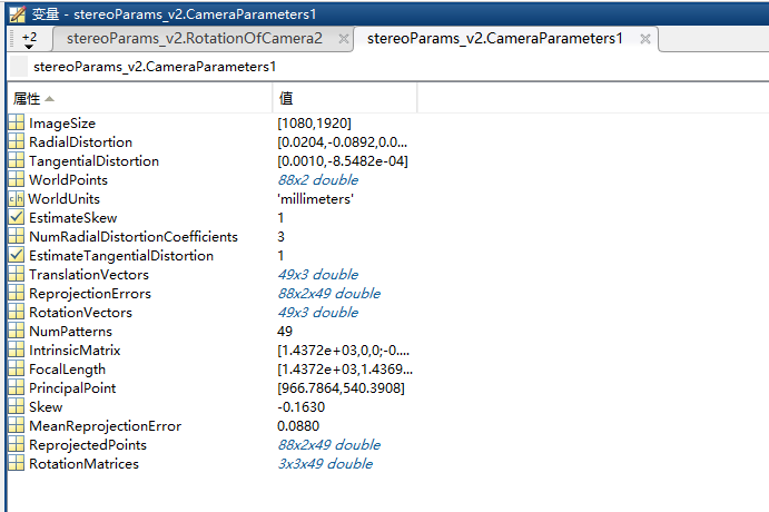 CameraParameters1与CameraParameters2为左右摄像头的单独标定参数。