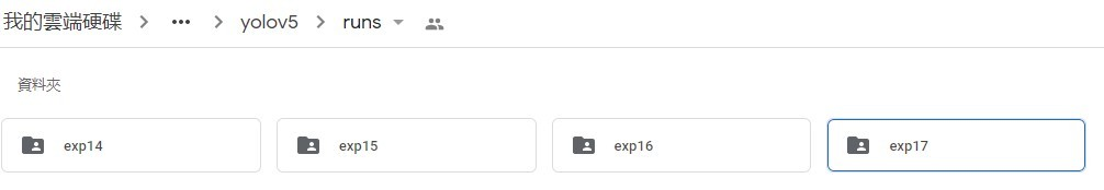 最後在run的資料夾中找到exp 的資料夾,像我訓練過很多次所以數字顯示17,總之就是找到最後一個數字就是最後一次訓練的: