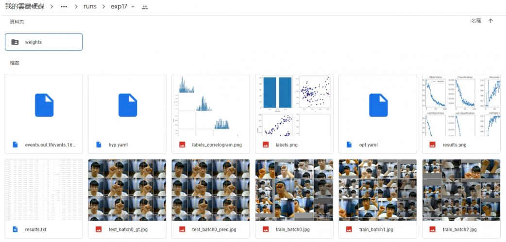 點開來可以看到有很多張驗證結果的圖片還有一個存放權重的資料夾:
