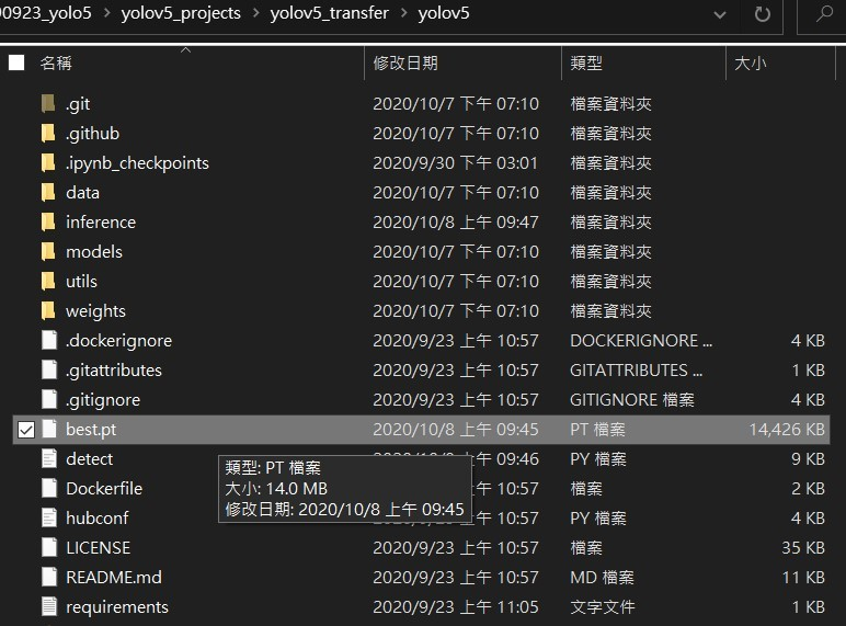 裡面通常會有兩個,一個是best一個last,就如字面上的意思就是最好的跟最後的,當然!看到best就直接選best!我們將其下載到我們電腦端的YOLOv5資料夾中。
