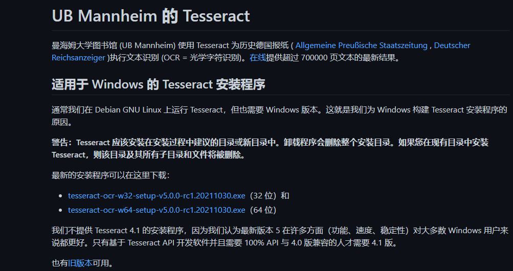 下载地址 https://digi.bib.uni-mannheim.de/tesseract/tesseract-ocr-w64-setup-v5.0.0-rc1.20211030.exe