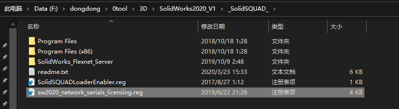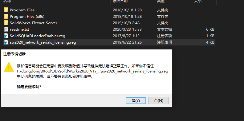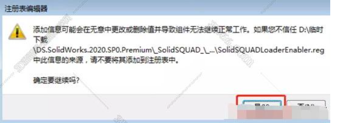 解压_SolidSQUAD_文件夹的_SolidSQUAD_文件,在_SolidSQUAD_文件夹中,双击运行"sw2020_network_serials_licensing.reg",继续点击“是”,点击“确定”即可。