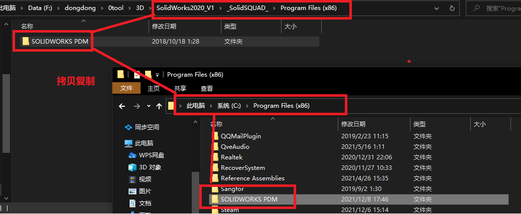 如果安装了PDM,复制文件夹“\_SolidSQUAD_\ProgramFiles (x86)\SOLIDWORKS PDM”至“D:\Program Files (x86)\SOLIDWORKS PDM”