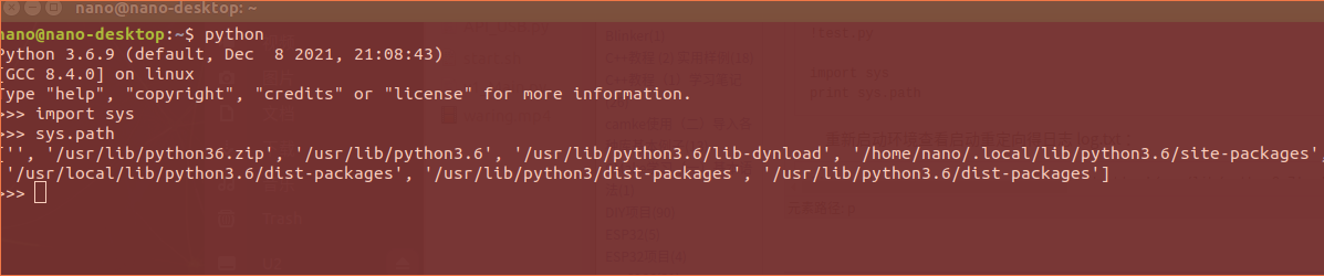 nvidia@nvidia-desktop:~/data/projects/dt_product$ python Python 2.7.15+ (default, Nov 27 2018, 23:36:35) [GCC 7.3.0] on linux2 Type "help", "copyright", "credits" or "license" for more information. >>> import sys >>> sys.path ['', '/home/nvidia/.local/lib/python2.7/site-packages', '/home/nvidia/data/projects/dt_product', '/usr/lib/python2.7', '/usr/lib/python2.7/plat-aarch64-linux-gnu', '/usr/lib/python2.7/lib-tk', '/usr/lib/python2.7/lib-old', '/usr/lib/python2.7/lib-dynload', '/usr/local/lib/python2.7/dist-packages', '/usr/lib/python2.7/dist-packages', '/usr/lib/python2.7/dist-packages/gtk-2.0'] >>>