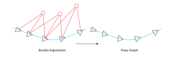 另一种情况是,使用基于所有数据的BA迭代几轮之后,计算相邻帧的相对位姿变换作为边,这时认为观测已经不怎么改变,也就是认为点的位置已经固定,则在应用schur技巧求解时可以忽略观测的边,仅仅利用位姿来求解,这时候的图也构成仅仅包含位姿作为节点、相对位姿作为边的图。此时也是仅对位姿进行优化,主要为降低求解时间,因为少解一个方程了,此时图中没有环,当然这样可能与pose graph通常认为的不一致,因为实际上观测数据还是在的,只不过并不去优化他们了,不过也有人把仅含有位姿的优化成为位姿图优化,因此这里也说明以下。