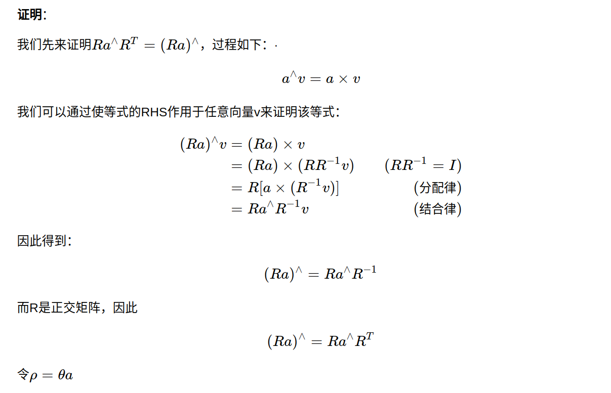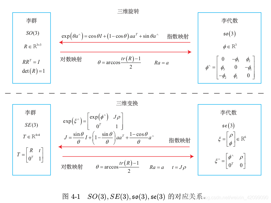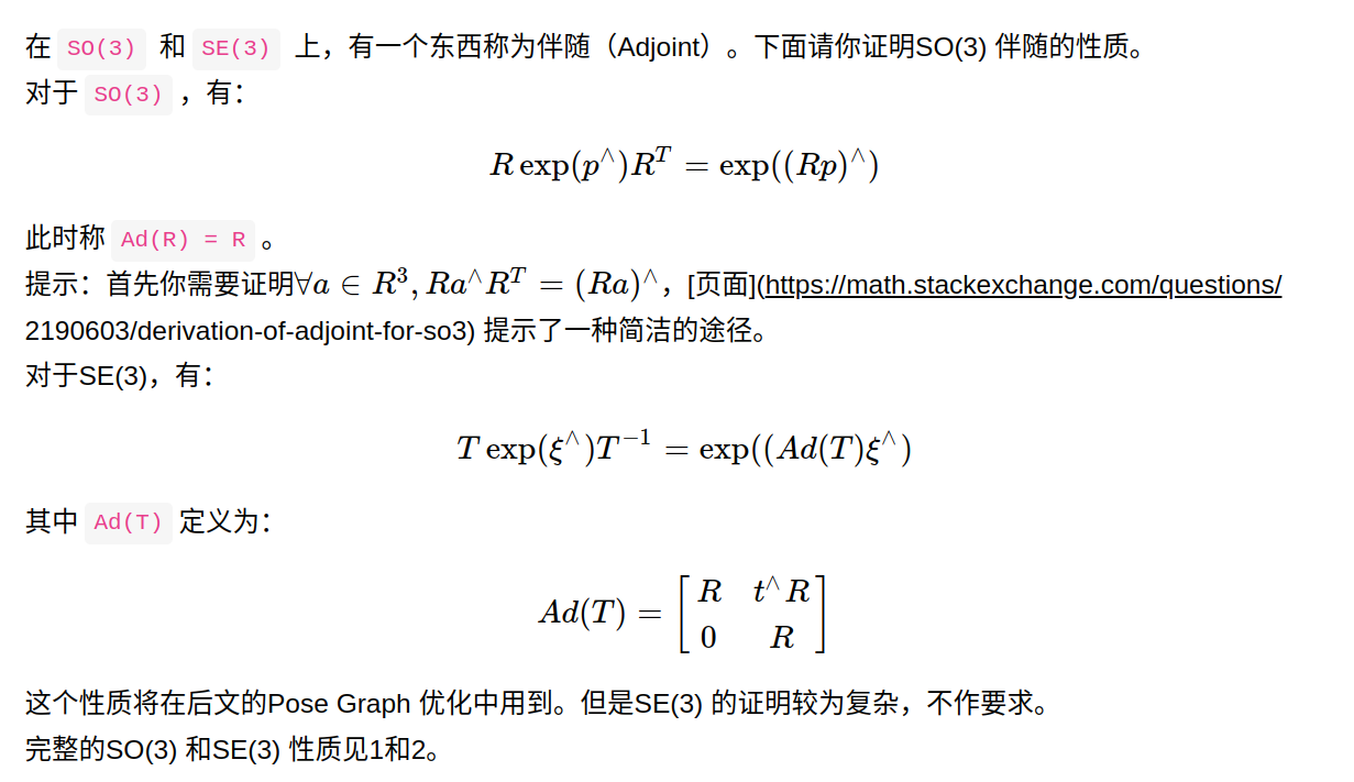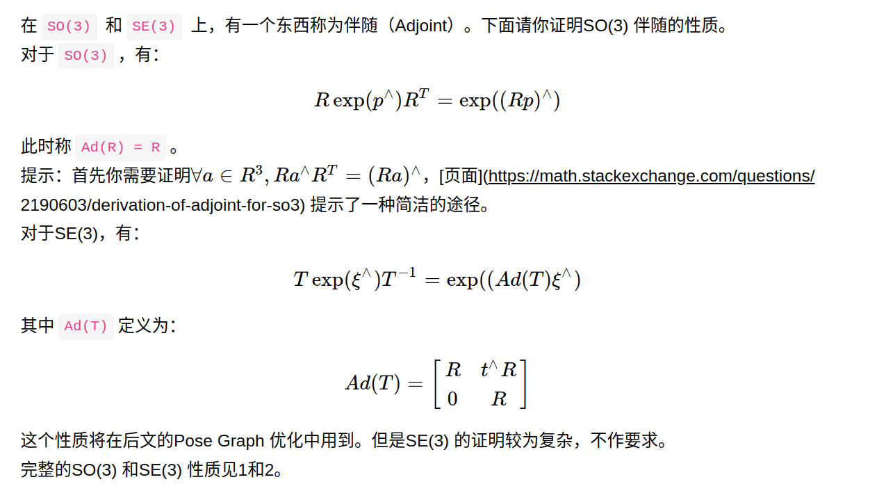 也就是说,不要红色的路标点了,只要位姿。位姿里的三角形是位姿,蓝色的线是两个位姿之间的变换。 【关于这点,有一个理解非常重要:三角形的位姿,是通过和世界坐标系的比较而得到的,其实世界坐标系在大部分情况下也就是一开机的时候的相机坐标系,把第一帧检测到的特征点的相机坐标,当成是世界坐标,以此为参照,逐步直接递推下去。而上图蓝色的线,是根据中途的两张图,单独拿它俩出来估计一个相对的位姿变换。 换言之:在前端的匹配中,基本都是世界坐标系的点有了,然后根据图像坐标系下的点,估计世界坐标系与图像坐标系下的变换关系作为位姿,(这里的世界坐标系下的坐标实际是根据第一帧一路递推下来的,可能错误会一路累积)我们假设算出来两个,分别是T1和T2。而蓝色的线,作为两个位姿之间的相对变换,也就是T1和T2之间的变换。但它并不是直接根据T1的逆乘以T2这种数学方式算出来的(不然还优化什么?肯定相等啊)而是通过T1和T2所在的图像进行匹配,比如单独算一个2D-2D之间的位姿变换或者光流法等,这样根据图像算出的位姿很有可能是和T1与T2用数学方式计算得到的位姿是有差异的(因为没有涉及到第一帧图像,就是单纯这两张图像的像素坐标)。这个理论一定要明白,不然纯粹是瞎学】 开始公式推导了,没看懂书上推导的可以看我这里的讲解: 先列一个李群的变换: