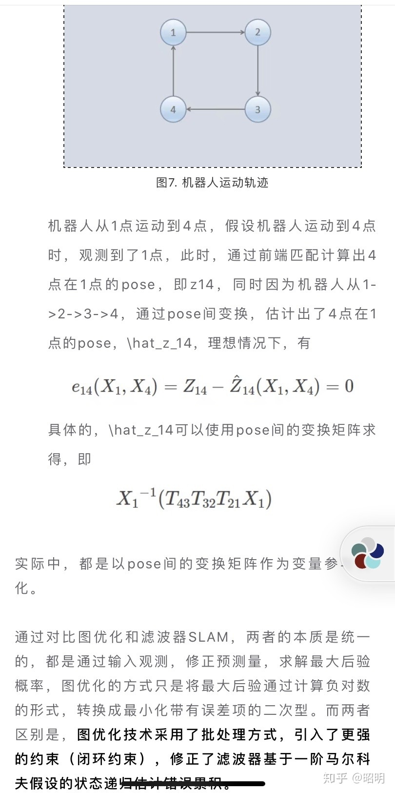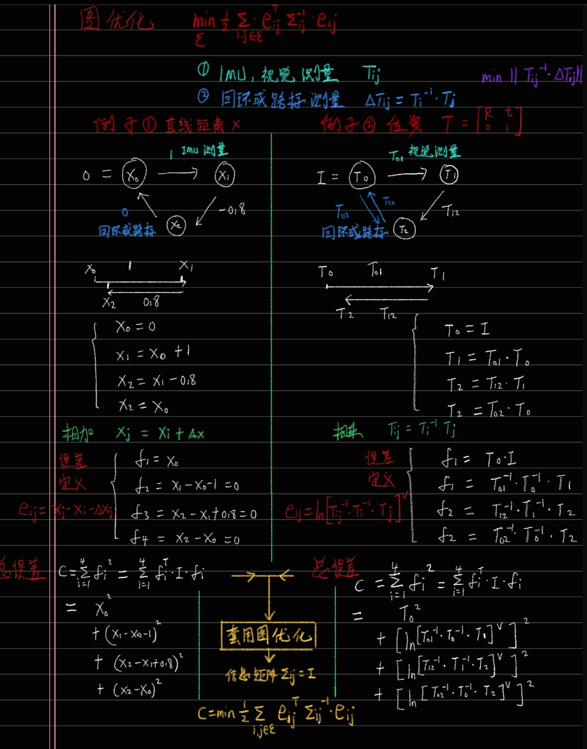 这两个位姿肯定不相等,因为有测量误差的存在,所有构建误差项,最小化总体误差,套用图优化,最后 求导f(x)'=0处的 x数值,就是最优的x位姿。