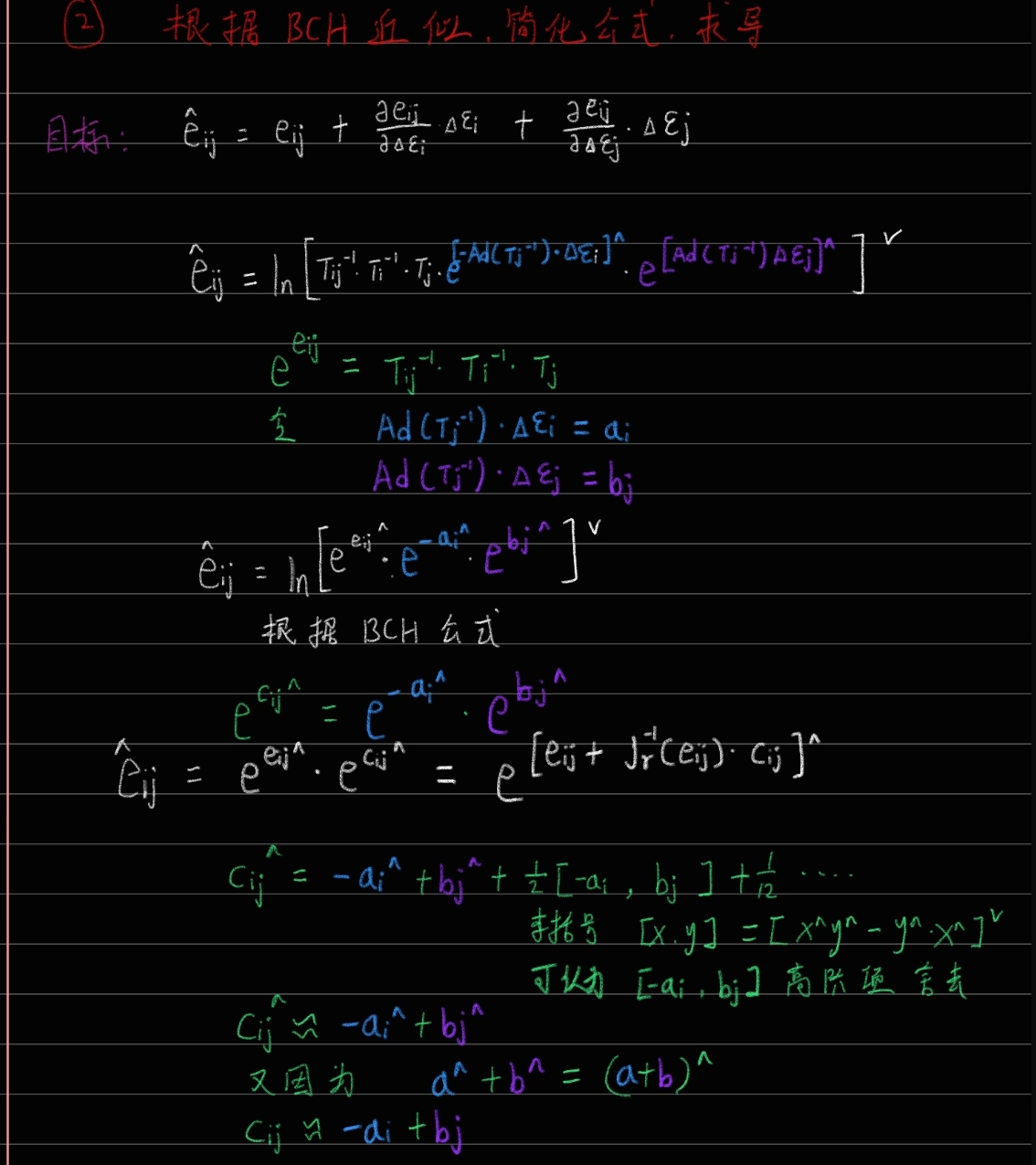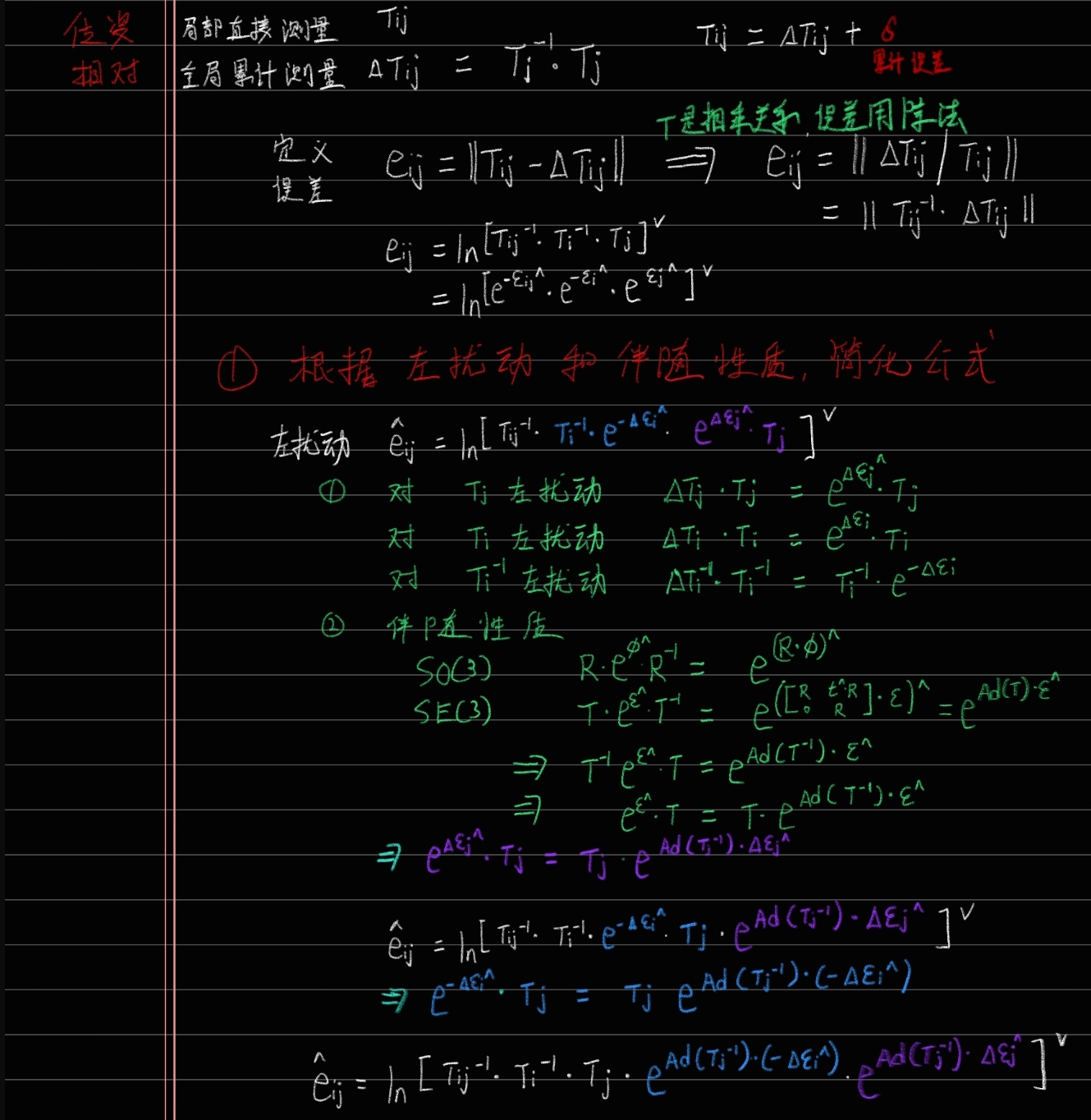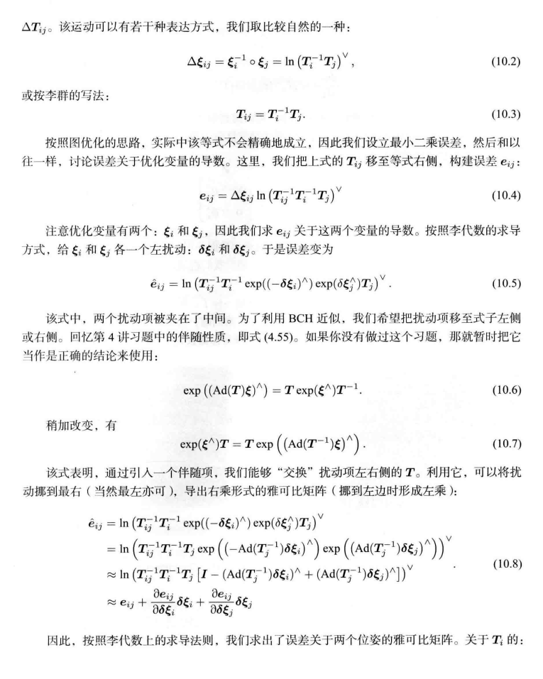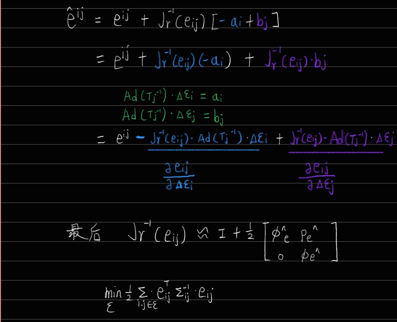 这个△的意思就是蓝色的边,两个位姿i和j之间的变换ij。 高博就把它乘到右边,那么左边就是1,求对数是0,通过这种方式来构造一个误差,使它为0: