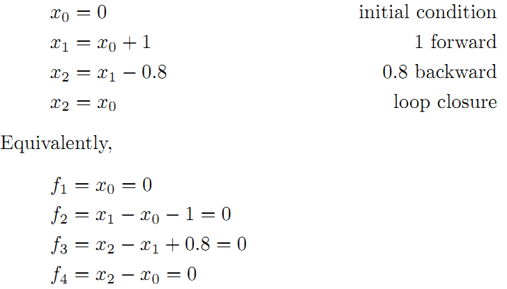 为了更好的理解这个过程,将用一个很好的例子作说明。如下图所示,假设一个机器人初始起点在0处,然后机器人向前移动,通过编码器测得它向前移动了1m,到达第二个地点。接着,又向后返回,编码器测得它向后移动了0.8米。但是,通过闭环检测,发现它回到了原始起点。可以看出,编码器误差导致计算的位姿和观测到有差异,那机器人这几个状态中的位姿到底是怎么样的才最好的满足这些条件呢?