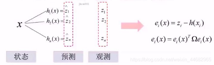 预测的特征点的位置和地图上的特征点的位置做差,优化预测的相机位置x,令差值最小(Ω是噪声,代表权重,噪声越大,权重应该越小)