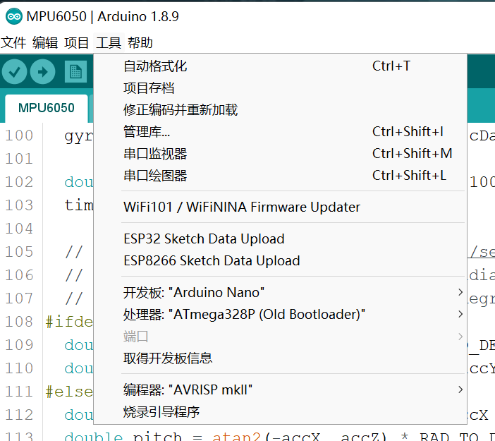 #ifdef RESTRICT_PITCH // Eq. 25 and 26 double roll = atan2(accY, accZ) * RAD_TO_DEG; double pitch = atan(-accX / sqrt(accY * accY + accZ * accZ)) * RAD_TO_DEG; #else // Eq. 28 and 29 double roll = atan(accY / sqrt(accX * accX + accZ * accZ)) * RAD_TO_DEG; double pitch = atan2(-accX, accZ) * RAD_TO_DEG; #endif