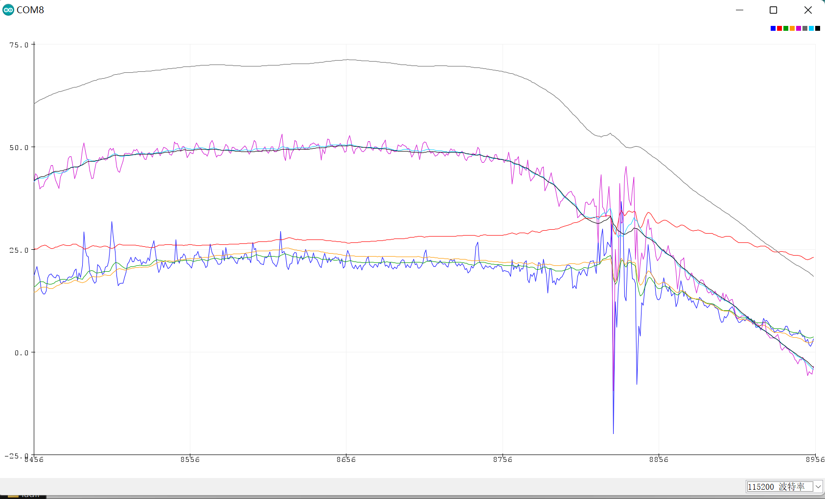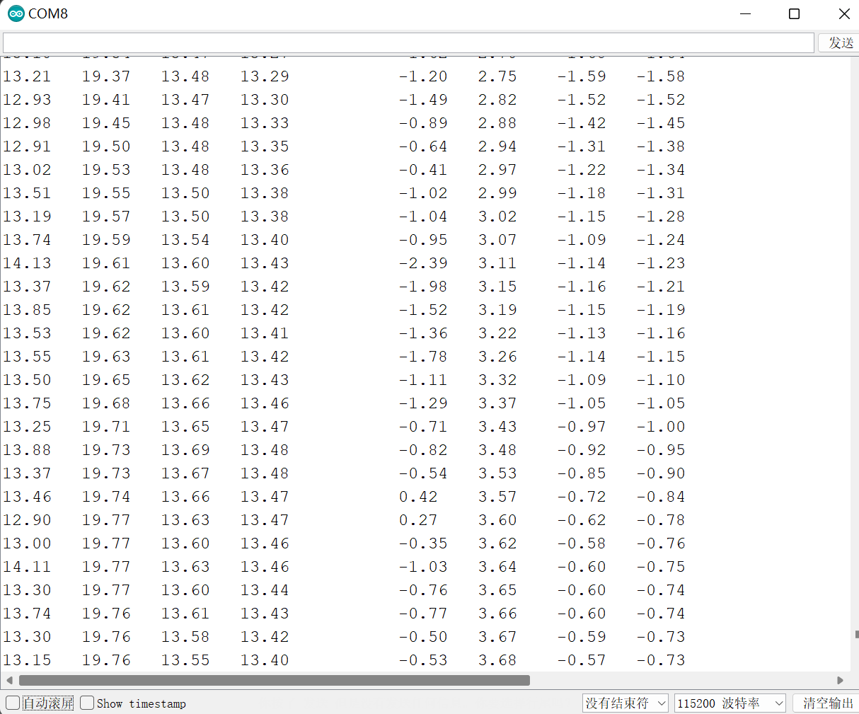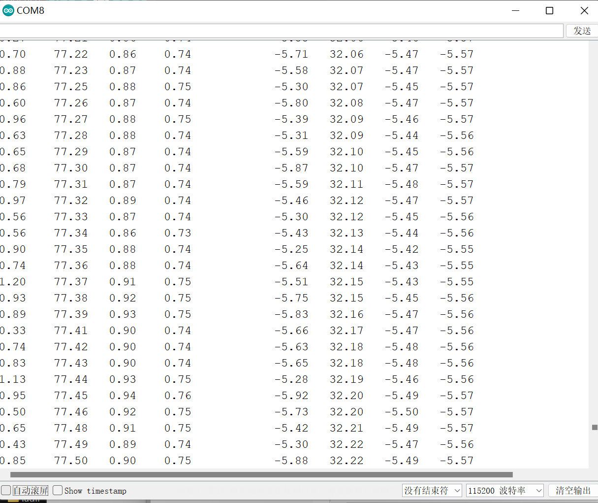 #include <Wire.h> uint32_t timer; uint8_t i2cData[14]; // Buffer for I2C data unsigned long now, lastTime = 0; float dt; //微分时间 int16_t ax, ay, az, gx, gy, gz; //加速度计陀螺仪原始数据 float aax=0, aay=0,aaz=0, agx=0, agy=0, agz=0; //角度变量 long axo = 0, ayo = 0, azo = 0; //加速度计偏移量 long gxo = 0, gyo = 0, gzo = 0; //陀螺仪偏移量 float pi = 3.1415926; float AcceRatio = 16384.0; //加速度计比例系数 float GyroRatio = 131.0; //陀螺仪比例系数 uint8_t n_sample = 8; //加速度计滤波算法采样个数 float aaxs[8] = {0}, aays[8] = {0}, aazs[8] = {0}; //x,y轴采样队列 long aax_sum, aay_sum,aaz_sum; //x,y轴采样和 float a_x[10]={0}, a_y[10]={0},a_z[10]={0} ,g_x[10]={0} ,g_y[10]={0},g_z[10]={0}; //加速度计协方差计算队列 float Px=1, Rx, Kx, Sx, Vx, Qx; //x轴卡尔曼变量 float Py=1, Ry, Ky, Sy, Vy, Qy; //y轴卡尔曼变量 float Pz=1, Rz, Kz, Sz, Vz, Qz; //z轴卡尔曼变量 void setup() { Serial.begin(115200); Wire.begin(); #if ARDUINO >= 157 Wire.setClock(400000UL); // Set I2C frequency to 400kHz #else TWBR = ((F_CPU / 400000UL) - 16) / 2; // Set I2C frequency to 400kHz #endif i2cData[0] = 7; // Set the sample rate to 1000Hz - 8kHz/(7+1) = 1000Hz i2cData[1] = 0x00; // Disable FSYNC and set 260 Hz Acc filtering, 256 Hz Gyro filtering, 8 KHz sampling i2cData[2] = 0x00; // Set Gyro Full Scale Range to ±250deg/s i2cData[3] = 0x00; // Set Accelerometer Full Scale Range to ±2g while (i2cWrite(0x19, i2cData, 4, false)); // Write to all four registers at once while (i2cWrite(0x6B, 0x01, true)); // PLL with X axis gyroscope reference and disable sleep mode while (i2cRead(0x75, i2cData, 1)); if (i2cData[0] != 0x68) { // Read "WHO_AM_I" register Serial.print(F("Error reading sensor")); while (1); } delay(100); // Wait for sensor to stabilize /* Set kalman and gyro starting angle */ unsigned short times = 200; //采样次数 for(int i=0;i<times;i++) { //accelgyro.getMotion6(&ax, &ay, &az, &gx, &gy, &gz); //读取六轴原始数值 while (i2cRead(0x3B, i2cData, 14)); ax = (int16_t)((i2cData[0] << 8) | i2cData[1]); ay = (int16_t)((i2cData[2] << 8) | i2cData[3]); az = (int16_t)((i2cData[4] << 8) | i2cData[5]); gx = (int16_t)((i2cData[8] << 8) | i2cData[9]); gy = (int16_t)((i2cData[10] << 8) | i2cData[11]); gz = (int16_t)((i2cData[12] << 8) | i2cData[13]);; axo += ax; ayo += ay; azo += az; //采样和 gxo += gx; gyo += gy; gzo += gz; } axo /= times; ayo /= times; azo /= times; //计算加速度计偏移 gxo /= times; gyo /= times; gzo /= times; //计算陀螺仪偏移 } void loop() { unsigned long now = millis(); //当前时间(ms) dt = (now - lastTime) / 1000.0; //微分时间(s) lastTime = now; //上一次采样时间(ms) while (i2cRead(0x3B, i2cData, 14)); ax = (int16_t)((i2cData[0] << 8) | i2cData[1]); ay = (int16_t)((i2cData[2] << 8) | i2cData[3]); az = (int16_t)((i2cData[4] << 8) | i2cData[5]); gx = (int16_t)((i2cData[8] << 8) | i2cData[9]); gy = (int16_t)((i2cData[10] << 8) | i2cData[11]); gz = (int16_t)((i2cData[12] << 8) | i2cData[13]);; float accx = ax / AcceRatio; //x轴加速度 float accy = ay / AcceRatio; //y轴加速度 float accz = az / AcceRatio; //z轴加速度 aax = atan(accy / accz) * (-180) / pi; //y轴对于z轴的夹角 aay = atan(accx / accz) * 180 / pi; //x轴对于z轴的夹角 aaz = atan(accz / accy) * 180 / pi; //z轴对于y轴的夹角 aax_sum = 0; // 对于加速度计原始数据的滑动加权滤波算法 aay_sum = 0; aaz_sum = 0; for(int i=1;i<n_sample;i++) { aaxs[i-1] = aaxs[i]; aax_sum += aaxs[i] * i; aays[i-1] = aays[i]; aay_sum += aays[i] * i; aazs[i-1] = aazs[i]; aaz_sum += aazs[i] * i; } aaxs[n_sample-1] = aax; aax_sum += aax * n_sample; aax = (aax_sum / (11*n_sample/2.0)) * 9 / 7.0; //角度调幅至0-90° aays[n_sample-1] = aay; //此处应用实验法取得合适的系数 aay_sum += aay * n_sample; //本例系数为9/7 aay = (aay_sum / (11*n_sample/2.0)) * 9 / 7.0; aazs[n_sample-1] = aaz; aaz_sum += aaz * n_sample; aaz = (aaz_sum / (11*n_sample/2.0)) * 9 / 7.0; float gyrox = - (gx-gxo) / GyroRatio * dt; //x轴角速度 float gyroy = - (gy-gyo) / GyroRatio * dt; //y轴角速度 float gyroz = - (gz-gzo) / GyroRatio * dt; //z轴角速度 agx += gyrox; //x轴角速度积分 agy += gyroy; //x轴角速度积分 agz += gyroz; /* kalman start */ Sx = 0; Rx = 0; Sy = 0; Ry = 0; Sz = 0; Rz = 0; for(int i=1;i<10;i++) { //测量值平均值运算 a_x[i-1] = a_x[i]; //即加速度平均值 Sx += a_x[i]; a_y[i-1] = a_y[i]; Sy += a_y[i]; a_z[i-1] = a_z[i]; Sz += a_z[i]; } a_x[9] = aax; Sx += aax; Sx /= 10; //x轴加速度平均值 a_y[9] = aay; Sy += aay; Sy /= 10; //y轴加速度平均值 a_z[9] = aaz; Sz += aaz; Sz /= 10; for(int i=0;i<10;i++) { Rx += sq(a_x[i] - Sx); Ry += sq(a_y[i] - Sy); Rz += sq(a_z[i] - Sz); } Rx = Rx / 9; //得到方差 Ry = Ry / 9; Rz = Rz / 9; Px = Px + 0.0025; // 0.0025在下面有说明... Kx = Px / (Px + Rx); //计算卡尔曼增益 agx = agx + Kx * (aax - agx); //陀螺仪角度与加速度计速度叠加 Px = (1 - Kx) * Px; //更新p值 Py = Py + 0.0025; Ky = Py / (Py + Ry); agy = agy + Ky * (aay - agy); Py = (1 - Ky) * Py; Pz = Pz + 0.0025; Kz = Pz / (Pz + Rz); agz = agz + Kz * (aaz - agz); Pz = (1 - Kz) * Pz; /* kalman end */ Serial.print(agx);Serial.print(","); Serial.print(agy);Serial.print(","); Serial.print(agz);Serial.println(); }