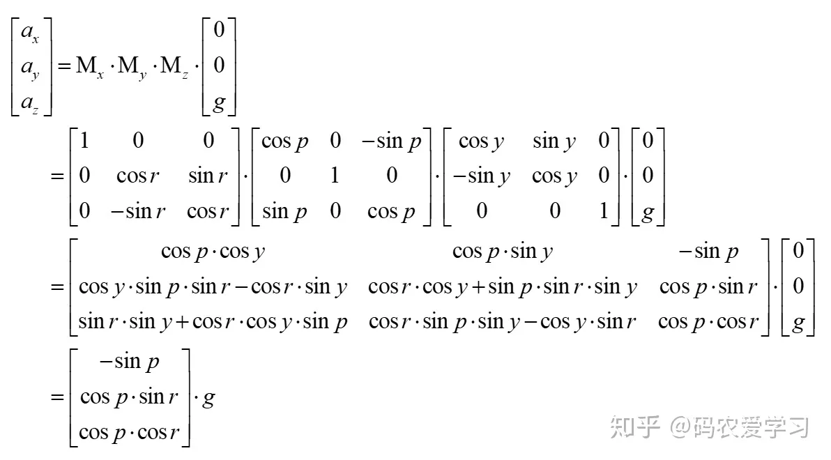 - 当加速度计旋转一定的姿态时,重力加速度会在加速度的3个轴上产生相应的分量,其本质是大地坐标系下的(0,0,g)在新的加速度计自身坐标系下的坐标,加速度计读到的3个值就是(0,0,g)向量的新坐标。