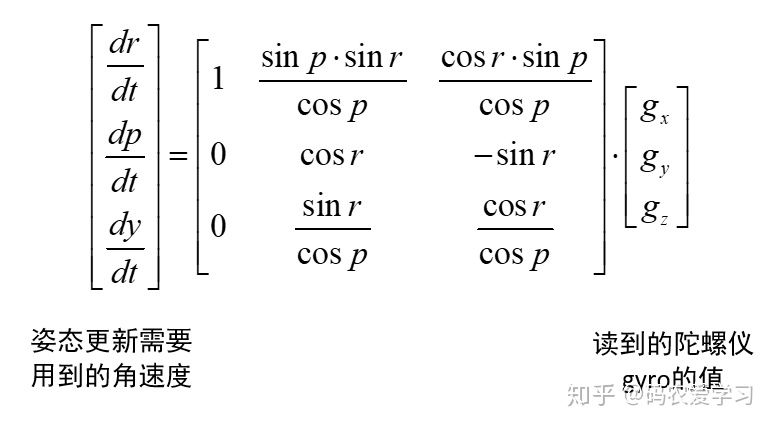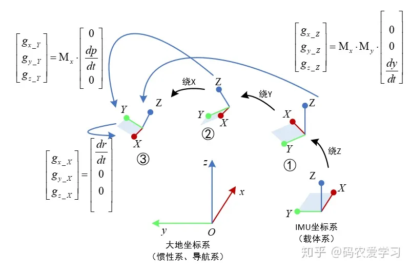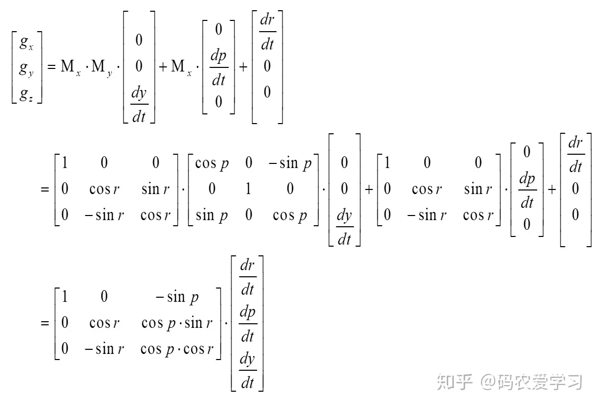 首先来看dy/dt,它是3次旋转过程中绕Z轴的yaw角的角速度,3次旋转首先就是绕着Z轴旋转,Z轴方向的单位向量可表示为[0 0 1]T,T表示向量转置,因此[0 0 dy/dt]T表示在图中状态①的坐标中绕Z的角速度。由于之后该坐标系还要经历绕Y和绕X的两次旋转,因此这里[0 0 dy/dt]T角速度在经历两次旋转后,在最终的坐标系(状态③)中的坐标也要经历两次变换。图中的[gx_Z gy_Z gz_Z]T表示3次旋转过程中绕Z轴的yaw角的角速度在最终姿态中的等效转动角速度,实际就是状态①坐标系中绕Z轴的角速度在状态③坐标系中的新的坐标。