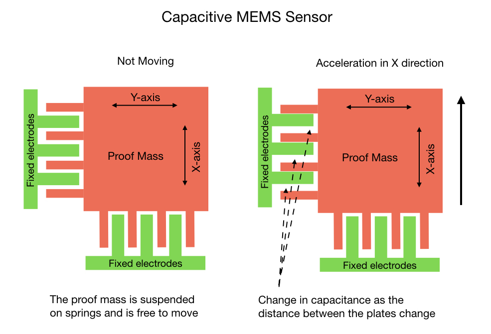 所谓的证明质量悬挂在弹簧上,并在设备加速时自由移动。固定的电极梳在自身和检测质量之间建立电容效应。当设备移动时,电容的变化会被记录并由 ADC 转换为 0 到 32,750 之间的数字值。陀螺仪以类似的方式工作,只是它基于科里奥利效应而不是加速度。