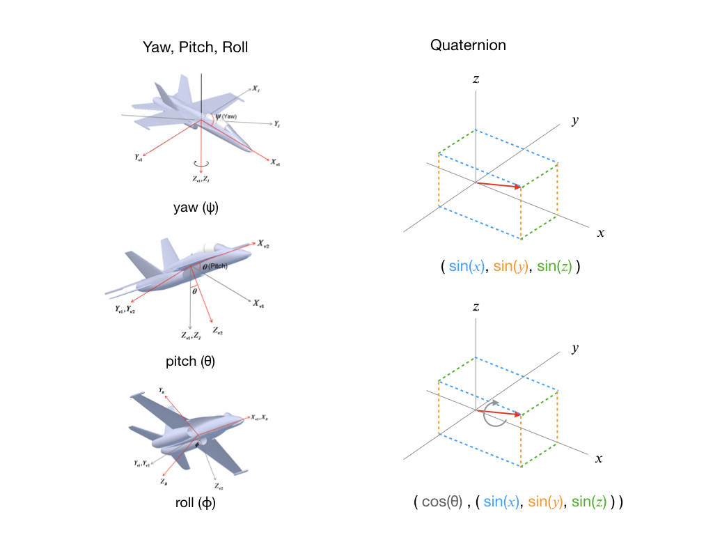 要理解四元数,将它们与 Yaw、Pitch、Roll 进行比较是很有用的,这是大多数人更熟悉的概念。要表示方向的变化,您首先要指定偏航角,即围绕 z 轴的旋转。然后加上Pitch,也就是绕y轴旋转。最后绕 x 轴滚动。当然,飞机可能会以不同的顺序执行此操作,或者更有可能同时执行此操作,但最终结果仍然是方向发生变化。这里的关键是你只需要三个参数 (ψ, θ, ϕ) 来表示转换。