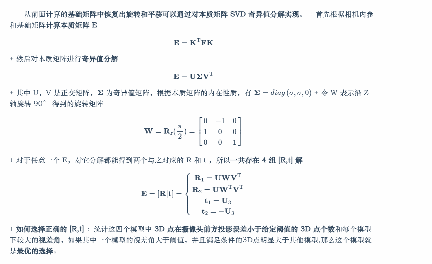 从前面计算的基础矩阵中恢复出旋转和平移可以通过对本质矩阵 SVD 奇异值分解实现。 + 首先根据相机内参和基础矩阵计算本质矩阵 E<span class="MathJax_Preview" style="color: inherit;">E=KTFK+ 然后对本质矩阵进行奇异值分解<span class="MathJax_Preview" style="color: inherit;">E=UΣVT+ 其中 U,V 是正交矩阵,<span class="MathJax_Preview" style="color: inherit;">Σ 为奇异值矩阵,根据本质矩阵的内在性质,有 <span class="MathJax_Preview" style="color: inherit;">Σ=diag(σ,σ,0) + 令 W 表示沿 Z 轴旋转 90° 得到的旋转矩阵<span class="MathJax_Preview" style="color: inherit;">W=Rz(π2)=⎡⎢⎣0−10100001⎤⎥⎦+ 对于任意一个 E,对它分解都能得到两个与之对应的 R 和 t ,所以一共存在 4 组 [R,t] 解<span class="MathJax_Preview" style="color: inherit;">E=[R|t]=⎧⎪ ⎪ ⎪ ⎪⎨⎪ ⎪ ⎪ ⎪⎩R1=UWVTR2=UWTVTt1=U3t2=−U3+ 如何选择正确的 [R,t] :统计这四个模型中 3D 点在摄像头前方投影误差小于给定阈值的 3D 点个数和每个模型下较大的视差角,如果其中一个模型的视差角大于阈值,并且满足条件的3D点明显大于其他模型,那么这个模型就是最优的选择。