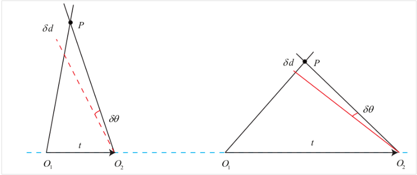 三角平移是由平移得到的,有平移才会有对极几何约束的三角形。因此,纯旋转是无法使用三角测量的,对极约束将永远满足。在平移时,三角测量有不确定性,会引出三角测量的矛盾。