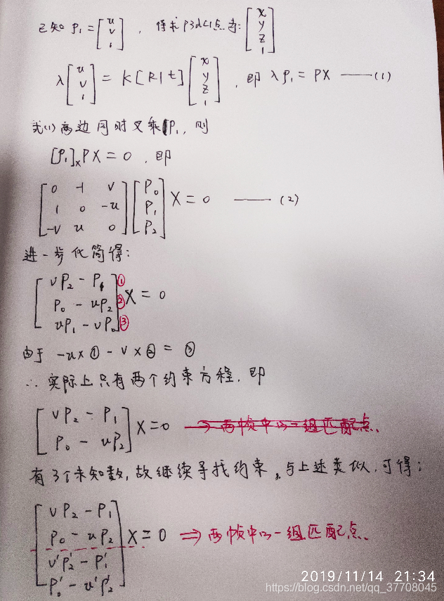从上述讲述中,我们已经知道通过两帧图像的匹配点,可以得到一个等式,可以计算出这一点的深度值,所以,如果有n副图像进行匹配,那我们会得到n-1个等式。