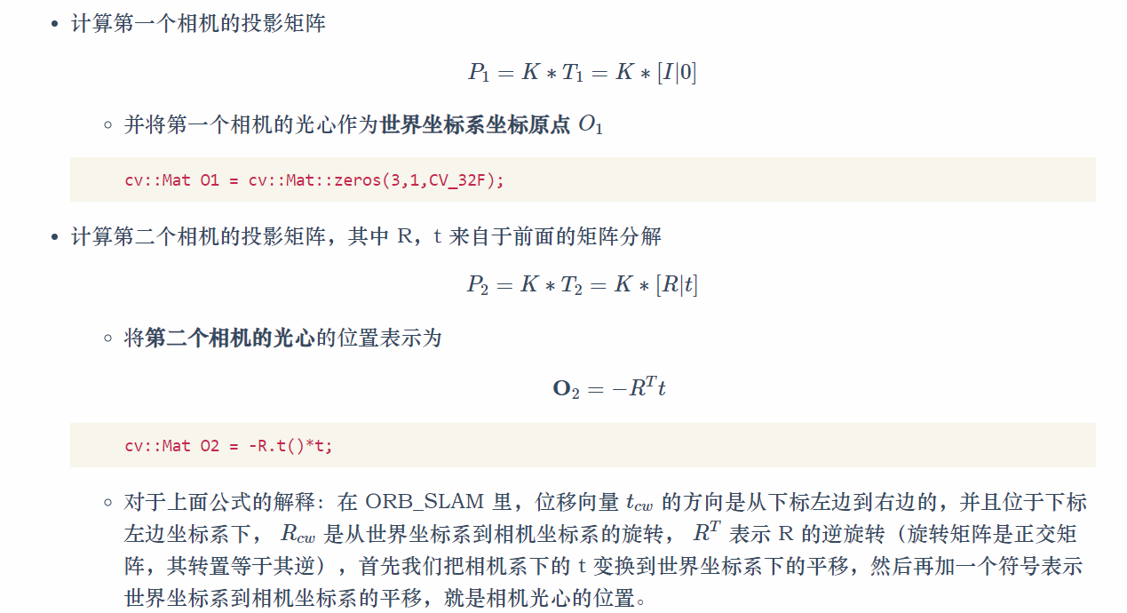 void triangulation ( const vector< KeyPoint >& keypoint_1, const vector< KeyPoint >& keypoint_2, const std::vector< DMatch >& matches, const Mat& R, const Mat& t, vector< Point3d >& points ) { //相机第一个位置处的位姿 Mat T1 = (Mat_<float> (3,4) << 1,0,0,0, 0,1,0,0, 0,0,1,0); //相机第二个位置处的位姿 Mat T2 = (Mat_<float> (3,4) << R.at<double>(0,0), R.at<double>(0,1), R.at<double>(0,2), t.at<double>(0,0), R.at<double>(1,0), R.at<double>(1,1), R.at<double>(1,2), t.at<double>(1,0), R.at<double>(2,0), R.at<double>(2,1), R.at<double>(2,2), t.at<double>(2,0) ); // 相机内参 Mat K = ( Mat_<double> ( 3,3 ) << 520.9, 0, 325.1, 0, 521.0, 249.7, 0, 0, 1 ); vector<Point2f> pts_1, pts_2; for ( DMatch m:matches ) { // 将像素坐标转换至相机平面坐标,为什么要这一步,上面推导中有讲 pts_1.push_back ( pixel2cam( keypoint_1[m.queryIdx].pt, K) ); pts_2.push_back ( pixel2cam( keypoint_2[m.trainIdx].pt, K) ); } Mat pts_4d; //opencv提供的三角测量函数 cv::triangulatePoints( T1, T2, pts_1, pts_2, pts_4d ); // 转换成非齐次坐标 for ( int i=0; i<pts_4d.cols; i++ ) { Mat x = pts_4d.col(i); x /= x.at<float>(3,0); // 归一化 Point3d p ( x.at<float>(0,0), x.at<float>(1,0), x.at<float>(2,0) ); points.push_back( p ); } } Point2f pixel2cam ( const Point2d& p, const Mat& K ) { return Point2f ( ( p.x - K.at<double>(0,2) ) / K.at<double>(0,0), ( p.y - K.at<double>(1,2) ) / K.at<double>(1,1) ); }