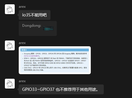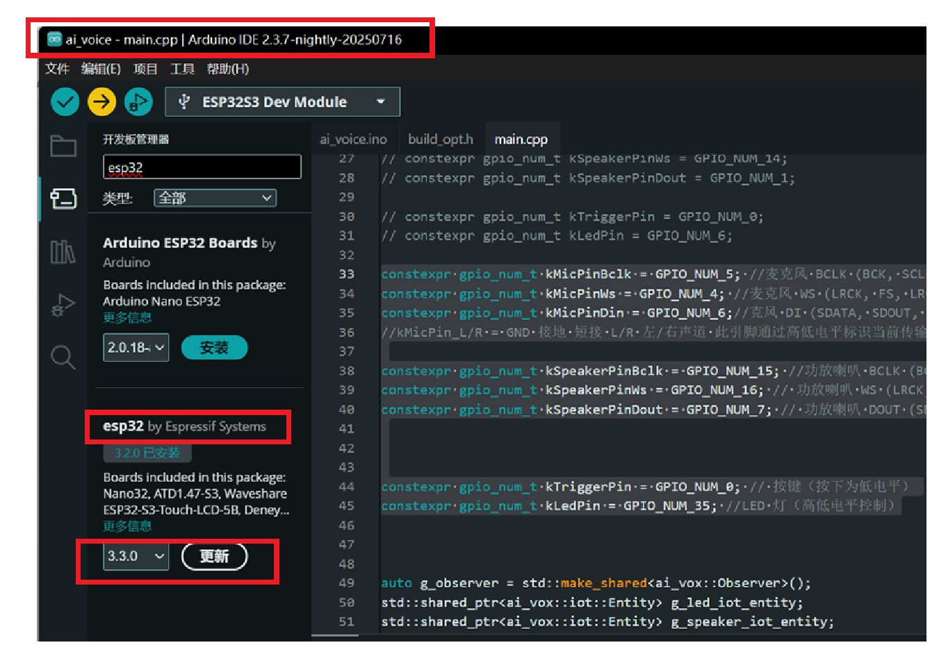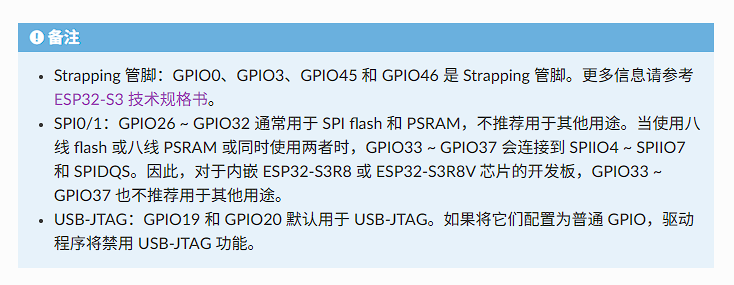 constexpr gpio_num_t kMicPinBclk = GPIO_NUM_5; //麦克风 BCLK (BCK, SCLK, SCK) constexpr gpio_num_t kMicPinWs = GPIO_NUM_4; //麦克风 WS (LRCK, FS, LRCLK) constexpr gpio_num_t kMicPinDin = GPIO_NUM_6;//克风 DI (SDATA, SDOUT, SDIN) //kMicPin_L/R = GND 接地 短接 L/R 左/右声道 此引脚通过高低电平标识当前传输的是左声道还是右声道数据 constexpr gpio_num_t kSpeakerPinBclk = GPIO_NUM_15; //功放喇叭 BCLK (BCK, SCLK, SCK) constexpr gpio_num_t kSpeakerPinWs = GPIO_NUM_16; // 功放喇叭 WS (LRCK, FS, LRCLK) LRC/WS左/右时钟(Word Select),标识当前传输的是左声道(低电平)还是右声道(高电平)。 constexpr gpio_num_t kSpeakerPinDout = GPIO_NUM_7; // 功放喇叭 DOUT (SDATA, SDOUT, SDIN) DOUT/SD 数据输出(Serial Data),音频数据通过此引脚输出到扬声器或 DAC。 constexpr gpio_num_t kTriggerPin = GPIO_NUM_0; // 按键(按下为低电平) constexpr gpio_num_t kLedPin = GPIO_NUM_48; // pin48 接的是一个w2812b灯珠。 pin35引脚是板载LED,自己不要用,不然程序会挂掉。