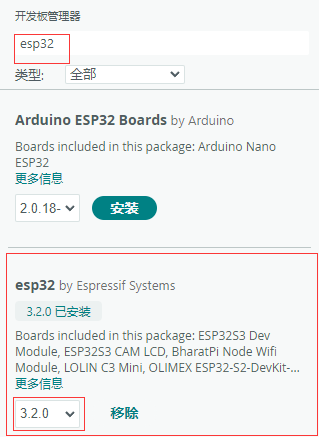 - 通过ESP32关键字进行筛选,并选择安装 esp32 by espressif Systems, 版本