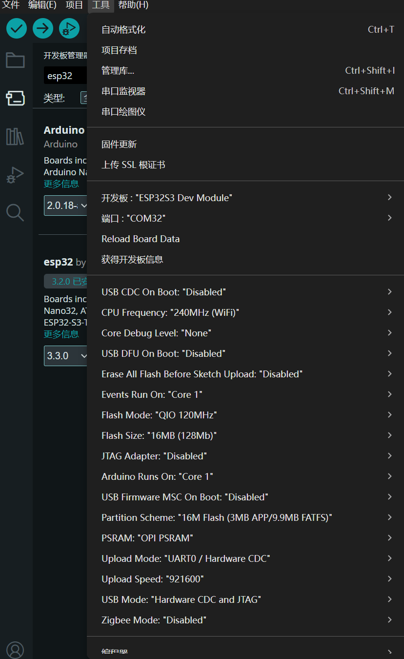 - 打开开发板管理器:Arduino IDE → 工具 → 开发板 → 开发板管理器