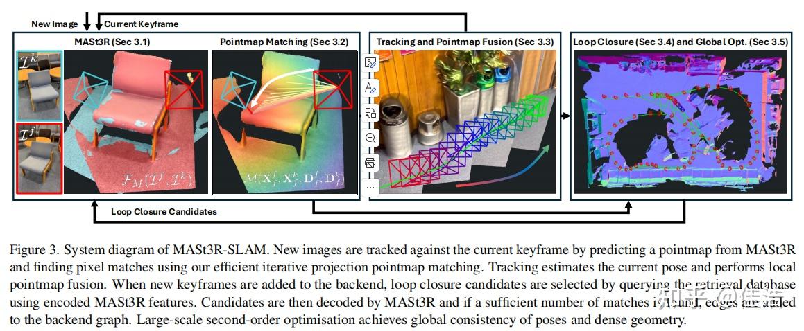 MASt3R-SLAM系统的核心方法,涵盖点图匹配、跟踪融合、图构建与回环检测、后端优化等关键环节,以下是方法论图: