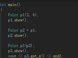 #include <iostream> using std::cout; using std::endl; class Point { public: Point(int x0 = 0, int y0 = 0); Point(const Point&p ); ~Point() = default; int get_x() const { return x; } int get_y() const { return y; } void show() const; private: int x, y; }; Point::Point(int x0, int y0): x{x0}, y{y0} { cout << "constructor called." << endl; } Point::Point(const Point& p): x{p.x}, y{p.y} { cout << "copy constructor called." << endl; } void Point::show() const { cout << "(" << x << ", "<< y << ")" << endl; } int main() { Point p1(4, 5); p1.show(); Point p2 = p1; p2.show(); Point p3{p2}; p3.show(); cout << p3.get_x() << endl; }