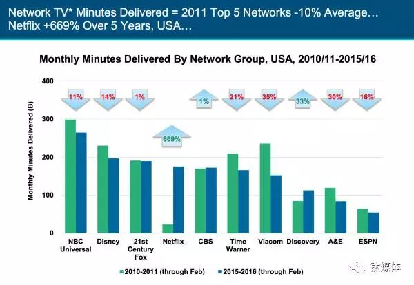 34、Netflix将电视台远远甩在背后与2010年相比,Neflix的视频事业增长了6.7倍,现在每月为用户推送1750亿分钟的视频内容,与此同时,各大电视台平均以10%的幅度衰退。虽然Netflix已占据30%的家庭娱乐收入总数,但平均用户收入仍在电视台之下,这也意味着用户逐渐放弃电视、转向线上平台会带来更多的收入增长机会。