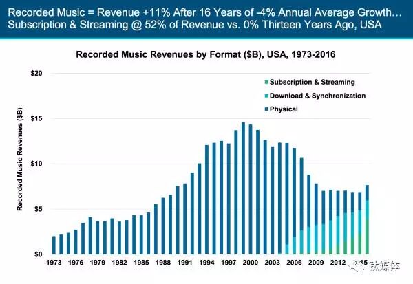 33、受益于流媒体,唱片市场收入终于开始增长经历了16年的衰落,由5千万Spotify用户带领的流媒体服务行业收入超过实体唱片,同时也带动了唱片市场的增长。