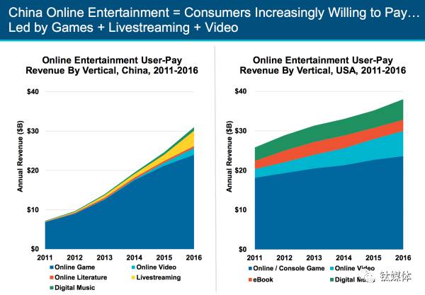 42、中国用户愿意为直播付费在2016年,中国用户对网络对战和角色扮演游戏的热爱让中国在互动游戏市场超越美国。两地市场的一个不同在于,中国用户愿意为他们喜欢的直播主播掏钱,送虚拟礼物、发送红包。