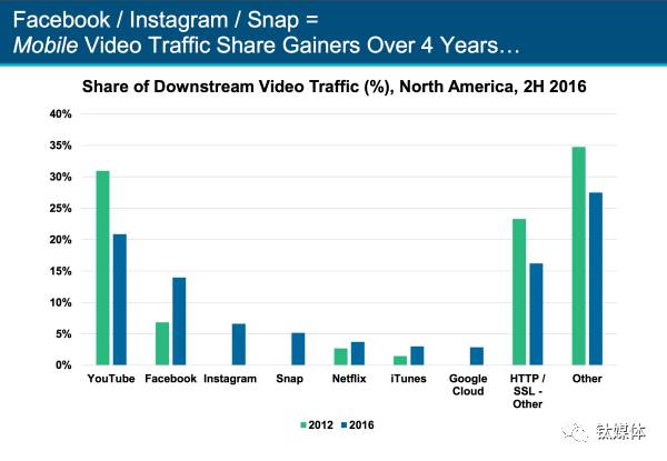 35、Youtube的移动视频市场份额降低,Facebook和Snap获得增长社交媒体App的便捷性、以及短视频让Facebook和Snap从Youtube那夺取份额,也驱动了移动视频市场的增长。