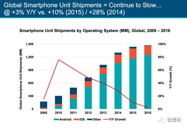 3、智能手机市场接近饱和智能手机的出货量增长从2014年开始增速放缓,今年仅有3%的增长,说明基本用户手上都有着一台智能手机了。