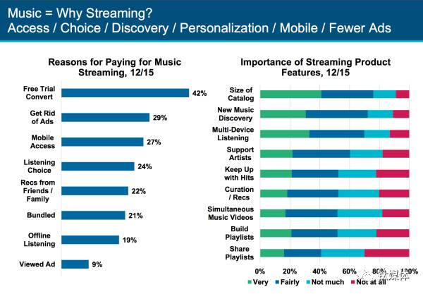 31、试用服务成流媒体订阅用户增长的驱动力 通过试用服务和广告支持,Spotify和Apple Music这些流媒体服务平台正在将普通用户转变为付费用户。Spotify成发现新音乐的重要平台。