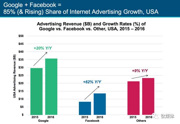 8、两家巨头的垄断局面谷歌和Facebook贡献了移动广告85%的增长,它们的占有率将持续增长。更多的数据意味着广告投放商能更准确把握目标用户的偏好,而谷歌和Facebook在用户数据上无人匹敌。