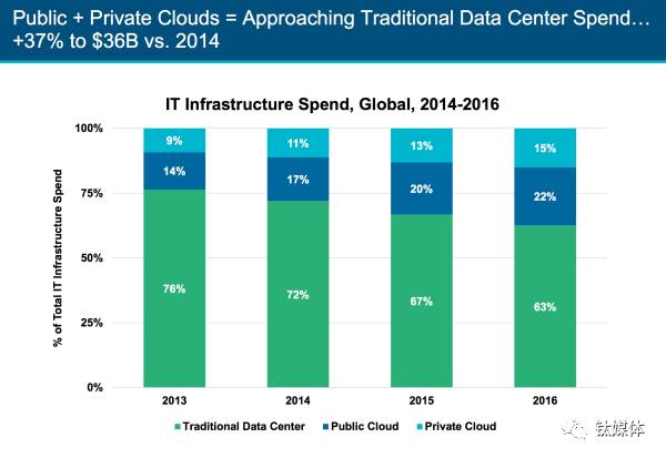 36、云支出向数据中心支出逼近 亚马逊AWS、Azure、和Google Cloud正在推动云支出增长,给API、浏览器插件、容器、分析数据中心、和边缘计算带来机会。