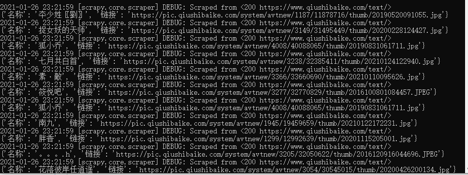 import scrapy class SpiderQiushiSpider(scrapy.Spider): #爬虫名字 name = 'spider_QiuShi' #域名限制列表,列表值可以设置多个,限制爬虫只爬取该域名下的网页 allowed_domains = ['www.qiushibaike.com'] #初始爬取地址 start_urls = ['http://www.qiushibaike.com/text'] def parse(self, response): div_list= response.xpath('//div[@class="col1 old-style-col1"]/div') items=[] for li in div_list: name= li.xpath('.//h2/text()')[0].extract().strip('\n').strip(' ') face_src= "https:"+li.xpath('.//div[1]/a[1]/img/@src')[0].extract().split('?')[0] item= { "名称":name, "链接":face_src } items.append(item) print(items) return items