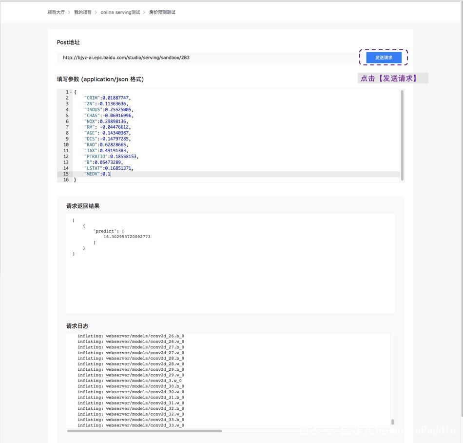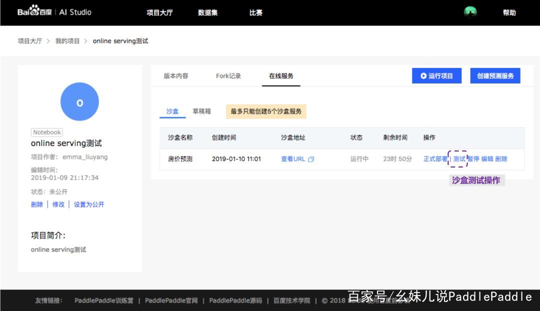 在线部署与预测为开发者提供训练模型向应用化API转换的功能. 开发者在AI Studio平台通过单机项目NoteBook页面完成模型训练后, 通过创建一个在线服务, 应用模型生成在线API, 使用该API可以直接检验模型效果或实际应用到开发者的私有项目中.目前, 该功能暂时仅对单机项目开放。