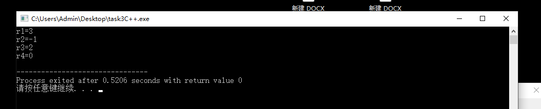 #include<stdio.h> int main(){ int x, y; //定义两个整型变量,用来保存运算数据 int r1,r2,r3,r4; //定义四个整型变量,用来保存加减乘除运算结果 x=1; y=2; r1=x+y; r2=x-y; r3=x*y; r4=x/y; printf("r1=%d\n",r1); printf("r2=%d\n",r2); printf("r3=%d\n",r3); printf("r4=%d\n",r4); return 0; }