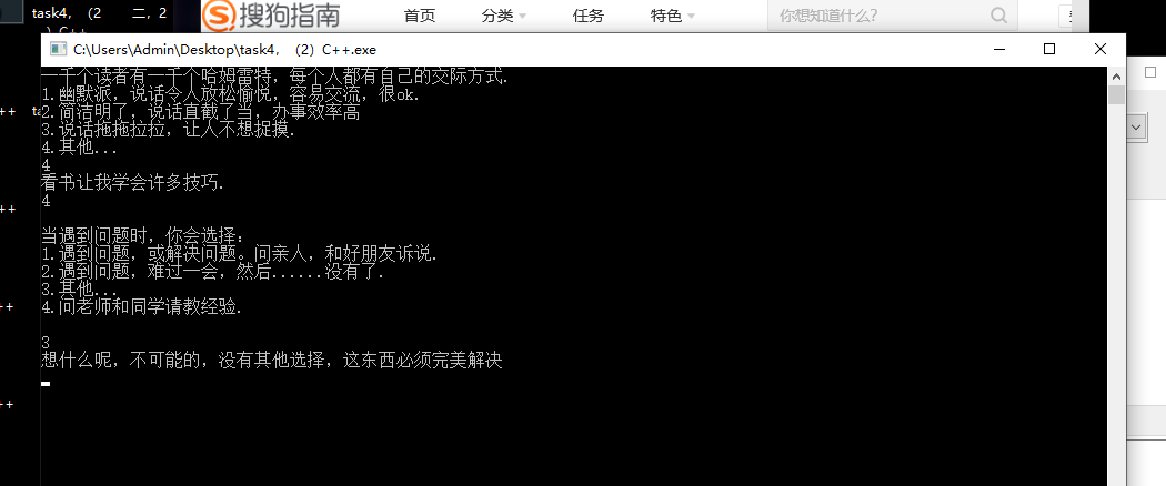//测试你是哪一类学习者 #include <stdio.h> int main(){ int answer; char words[5000]; printf("在家上学让一些人欢喜一些人忧.\n"); printf("1.作为一个宅,社恐,觉得这样很好,有网络,自主学习,很ok.\n"); printf("2.不喜,不喜,很不喜,眼睛快瞎了,脑壳有点卡...\n"); printf("3.中间派,不知道,说不清.\n"); printf("4.其他...\n"); printf("5.喜欢在家打游戏,却有厌烦上课打卡的矛盾心理.\n"); scanf("%d",&answer); if(answer==4){ printf("自律的生活让我安心.\n"); getchar(); gets(words); } printf("\n"); printf("当遇到问题时,你会选择:\n"); printf("1.遇到问题,或解决问题。不懂得,搜索式学习,逐个击破.\n"); printf("2.遇到问题,不高兴,然后......没有了.\n"); printf("3.其他...\n"); printf("4.问老师和同学.\n"); scanf("%d",&answer); if(answer==1) printf(":)\n") ; else if(answer==2) printf("这样不能解决问题啊......我们选择1好不好:)\n"); else if(answer==3){ printf("想什么呢,不可能的,没有其他选择,你必须把问题解决\n"); getchar(); gets(words); } return 0; }